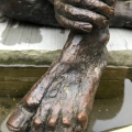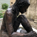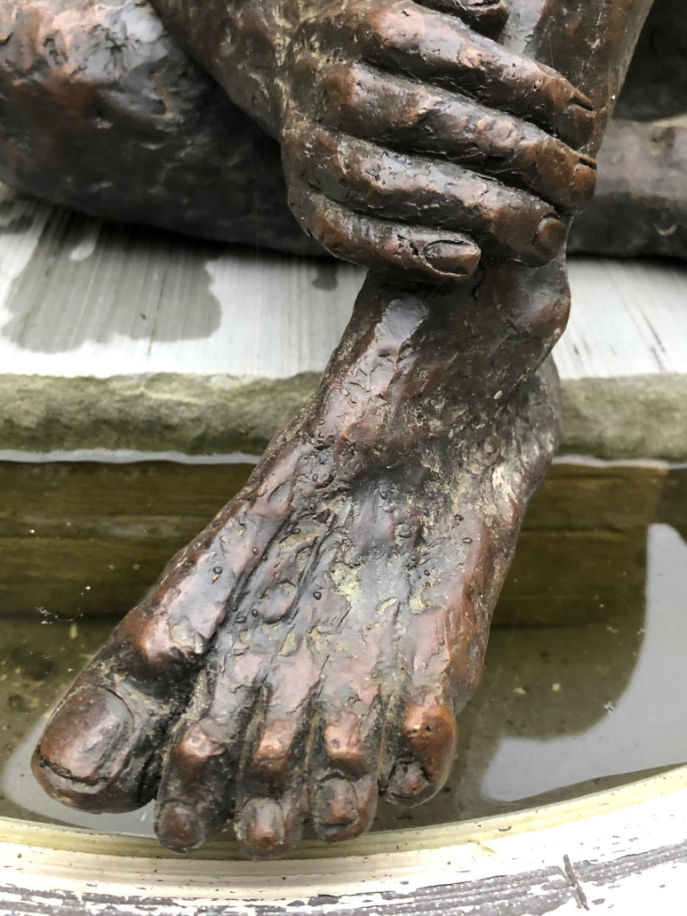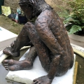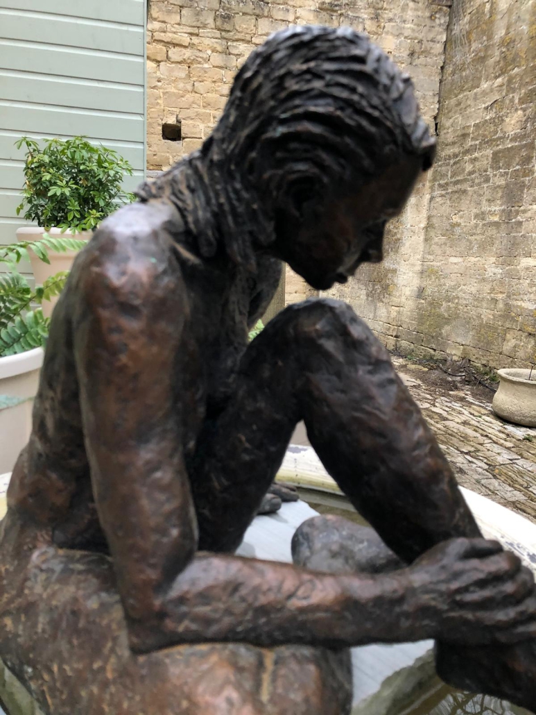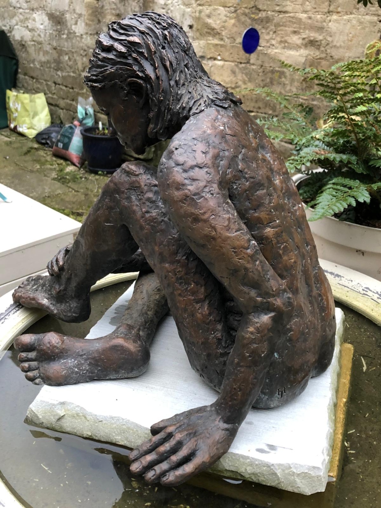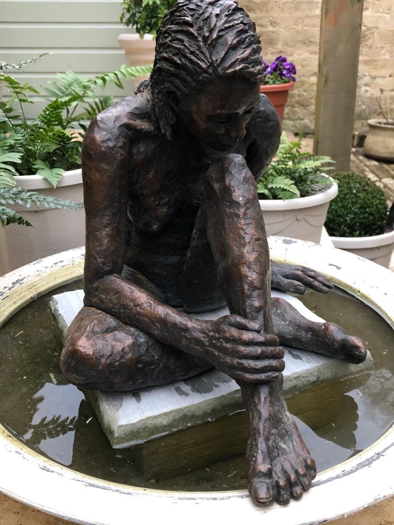 Bronze piece, ½ life-size.  She can be placed well  in the garden or on a terrace.   She sits very happily near a garden pond and with solar battery help can present as a fountain.   She is piped within the outer frame allowing the water to flow gently from the centre of her head, down the strands of hair into the reservoir below.